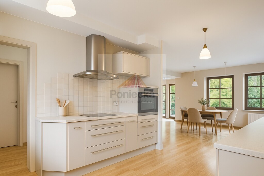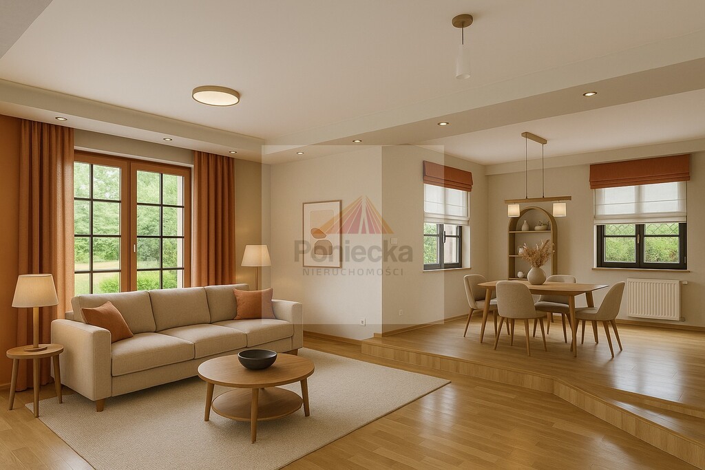Przestronny salon połączony z aneksem kuchennym, co stwarza idealne warunki do rodzinnych spotkań i przyjęć.
