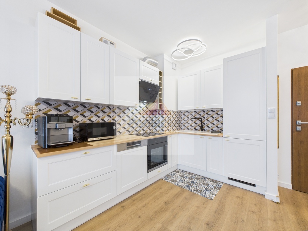 - funkcjonalnego aneksu kuchennego wyposażonego w wysokiej klasy sprzęt AGD (lodówko-zamrażarka, piekarnik, płyta indukcyjna, okap, zmywarka, ekspres do kawy, mikrofalówka, czajnik elektryczny) oraz wysokiej jakości drobne wyposażenie kuchni
