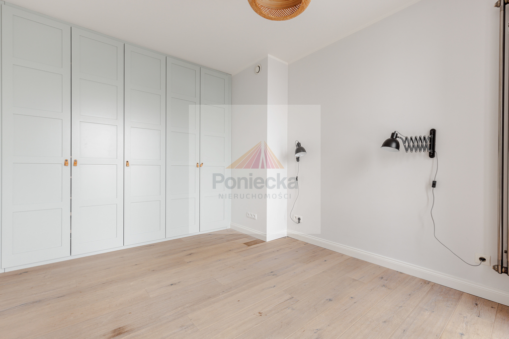 Z jednej z sypialni jest wyjście na balkon z którego rozpościera się wspaniały widok na dachy okolicznych kamienic i wieżowce w centrum Warszawy.
