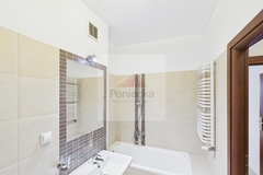 łazienka wyposażona w wannę, umywalkę, WC i pralkę