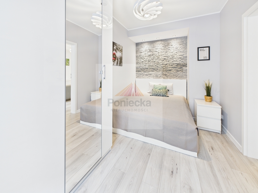 Wnętrze zostało wyposażone w dobrej jakości sprzęt i zabudowę, a liczne szafy i praktyczne rozwiązania zapewniają mnóstwo miejsca do przechowywania, dzięki czemu mieszkanie pozostaje zawsze uporządkowane i funkcjonalne.