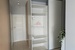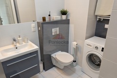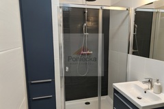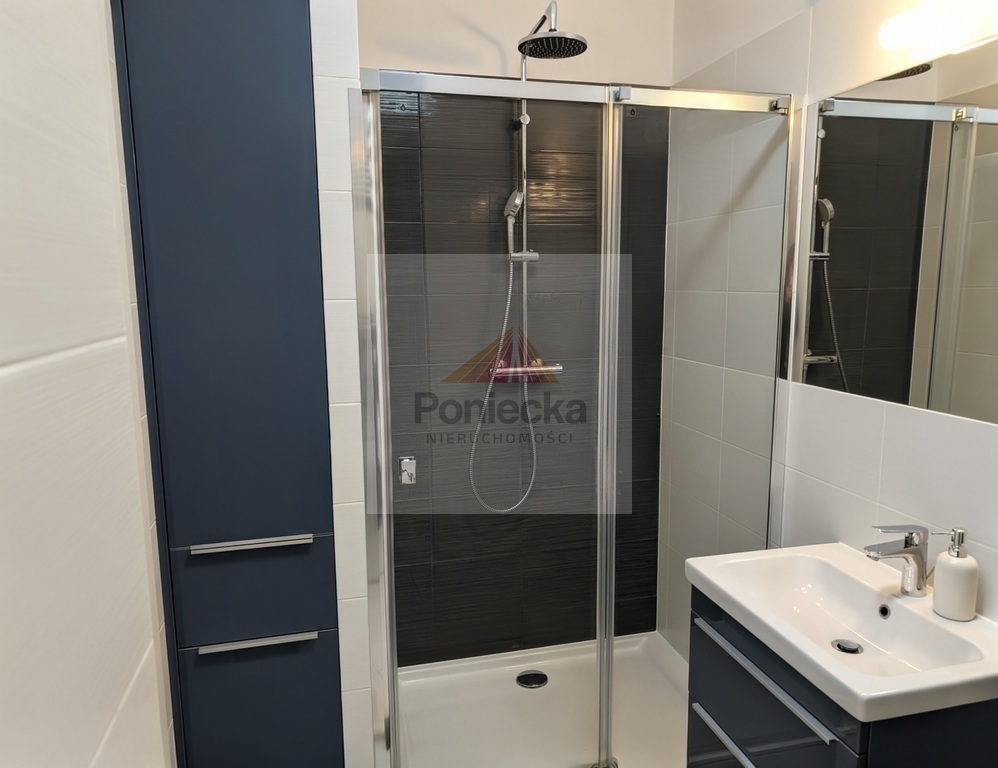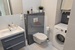 Łazienka duża kabina prysznicowa, umywalka, pralka, wbudowana szafka, toaleta.