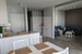 Salon z jadalnią w pełni wyposażone kanapa, fotel, stolik kawowy, stół jadalniany, krzesła. Jest możliwość oddzielenia salonu od jadalni i kuchni przesuwną szklaną ścianą.