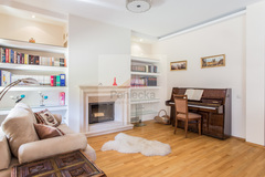 Na parterze znajduje się salon z kominkiem oraz zabudową biblioteczną, który łączy się z jadalnią i kuchnią.