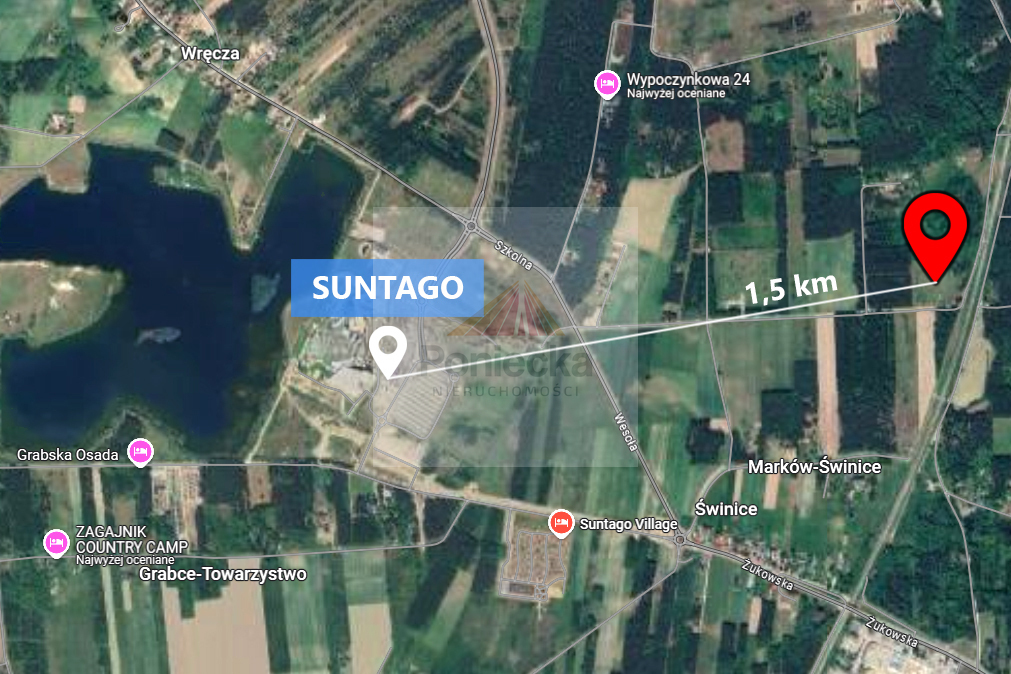 W sąsiedztwie Suntago, największego parku wodnego w Polsce, znajduje się działka budowlano-usługowa nr ewid. 40/18, o powierzchni 1700 m2 i wymiarach 35 x 48 . Położenie w pierwszej linii zabudowy, przy ulicy Spacerowej - droga ta jest utwardzoną drogą gminną, co zapewnia wygodny dojazd do działki. Bliskość Suntago i terenów rekreacyjnych sprawia, że to miejsce doskonale nadaje się zarówno pod zabudowę mieszkaniową, jak i usługi turystyczne czy rekreacyjne.