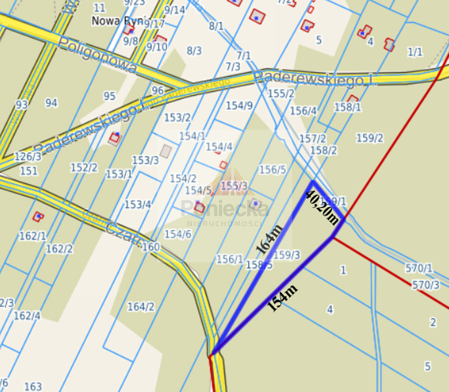 Rynia, Gmina Dobre, powiat miński. Działka nr 159/3, 3 287m2, szerokość 40,2m, głębokość 164/154m.
