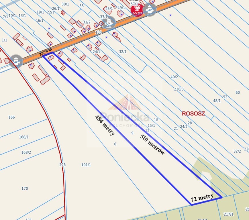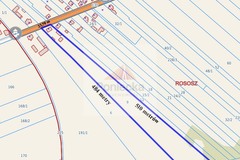 Działka dochodzi do lasu. Szerokość działki od asfaltu to 23,70m, szerokość od lasu to 72 metry. Długość działki 484/5140 metrów.