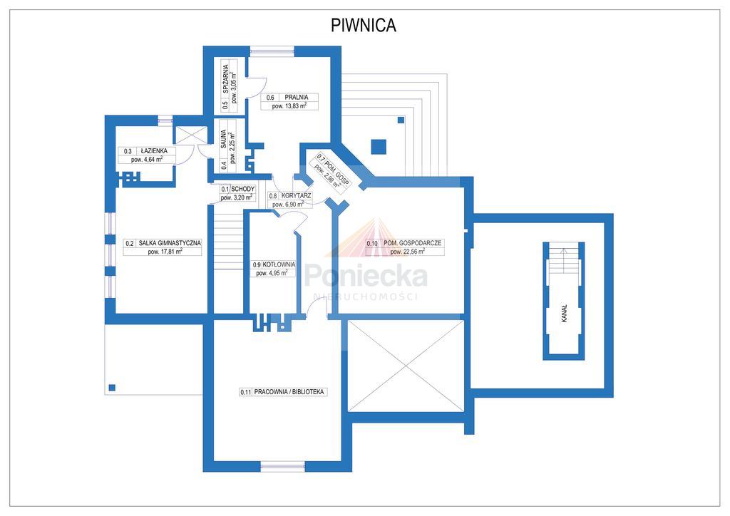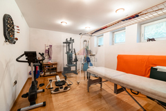 Dom jest częściowo podpiwniczony. W ładnie zagospodarowanym przyziemiu znajduje się salka do ćwiczeń (cały znajdujący się tam sprzęt zostaje w nieruchomości dla nowych właścicieli), pokój kominkowy (27m2), sauna, łazienka, pralnia, 2 spiżarnie oraz kotłownia.
