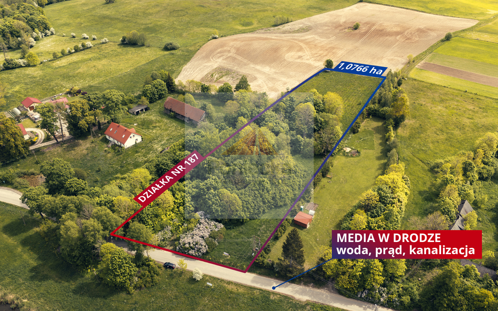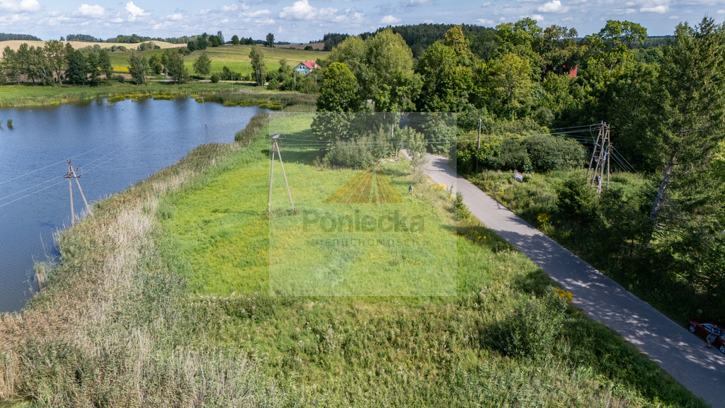 Na sprzedaż działka budowlana o nr. ew. 187 oraz powierzchni 1,0766 ha, położona naprzeciwko jeziora.