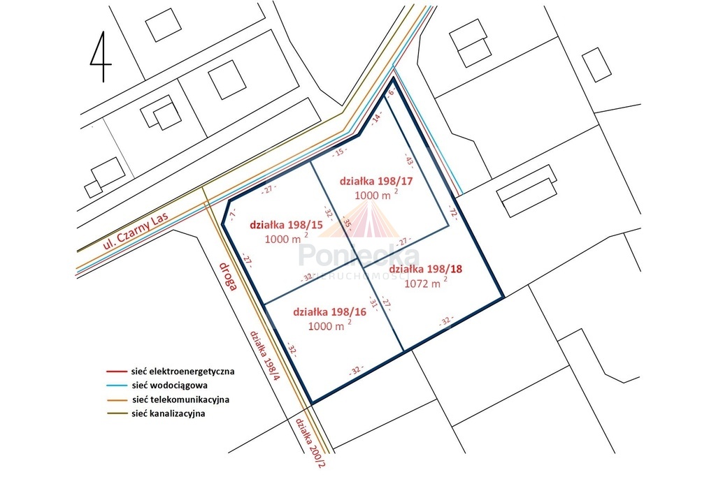 Grunt został podzielony na 4 działki po ok. 1000 m2. Każda z nich pozwala na budowę bliźniaka. Teren daje prosty i czytelny układ pod 4 budynki bliźniacze. Obecnie istnieje możliwość zakupu pojedynczych działek.