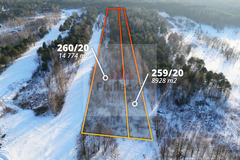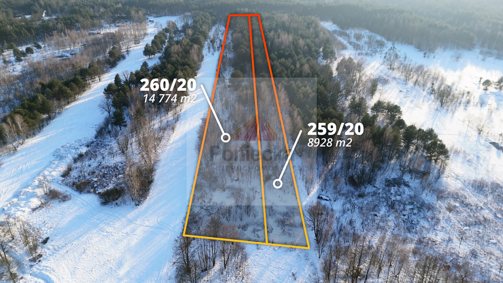 Na sprzedaż działka rolno-leśna o łącznej powierzchni 2,37566 ha (23 756 m2), składająca się z dwóch działek 259/20 oraz 260/20. Szerokość łączna około 32 metry, długość około 743 metry.