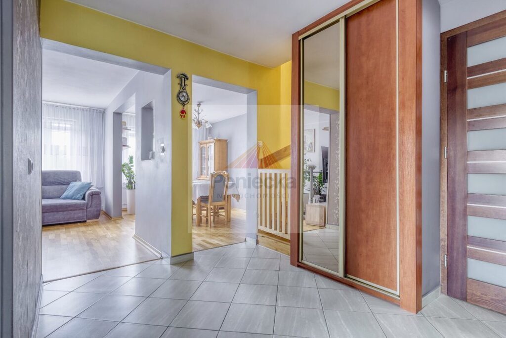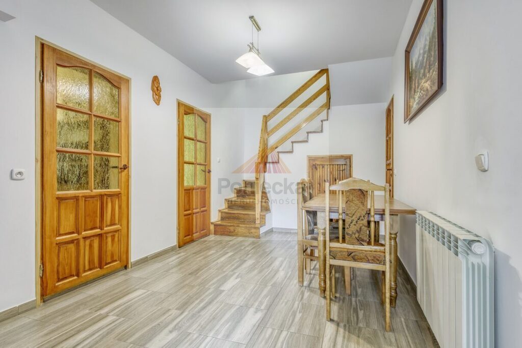 Poziom posiada oddzielne wejście, istnieje również przejście na piętro dębowymi schodami. Drzwi wejściowe, antywłamaniowe.