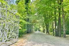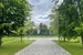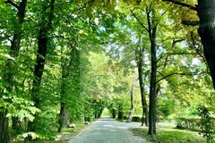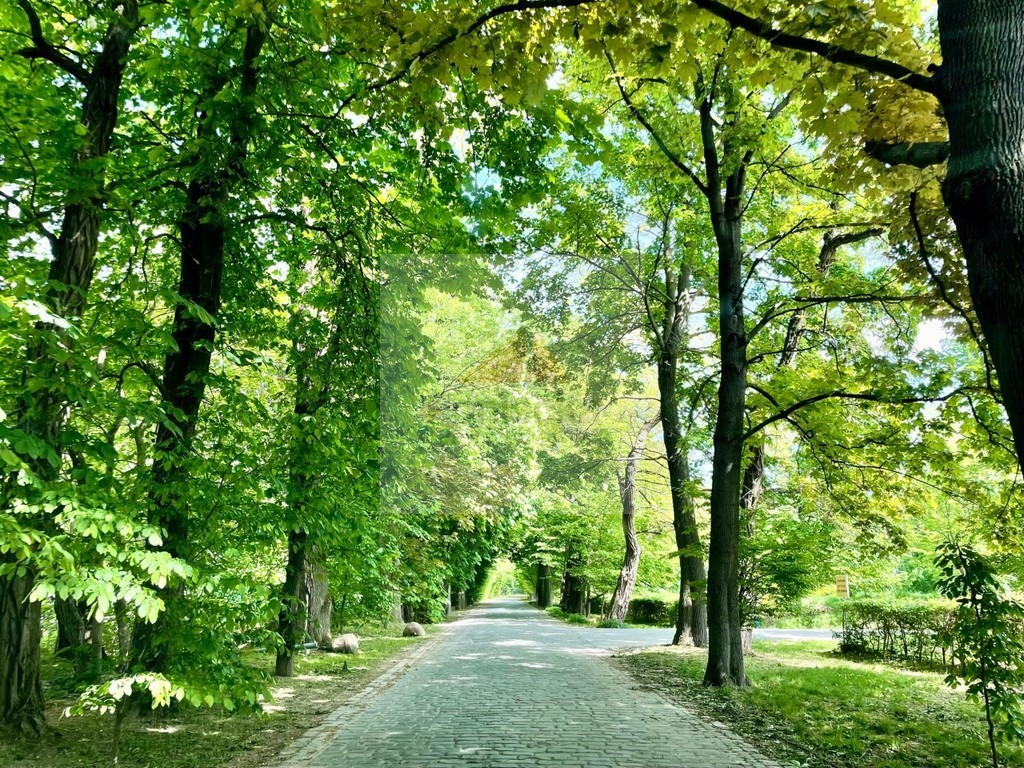 Wjazd brukowaną kostką bazaltową aleją z starymi klonami i kasztanami.