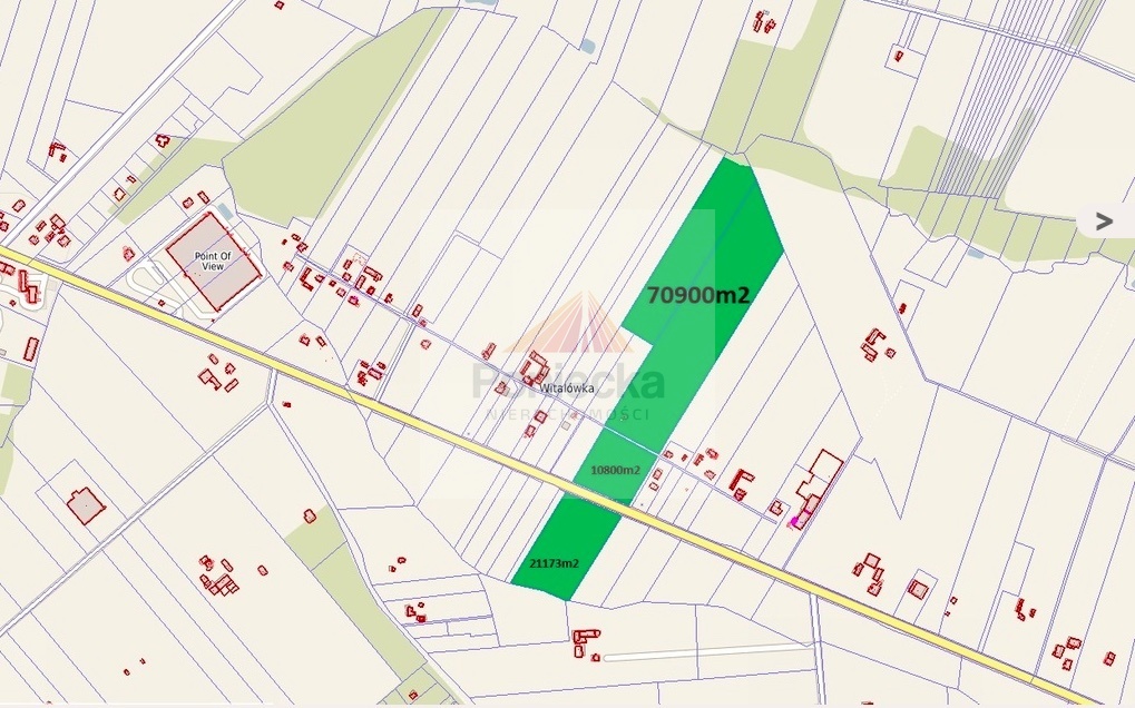 Działka inwestycyjna w miejscowości Witalówka, gm. Pniewy o łącznej powierzchni 10871m2 a. Położona przy trasie E50 między Grójcem a Mszczonowem.