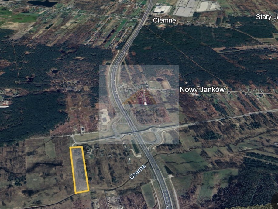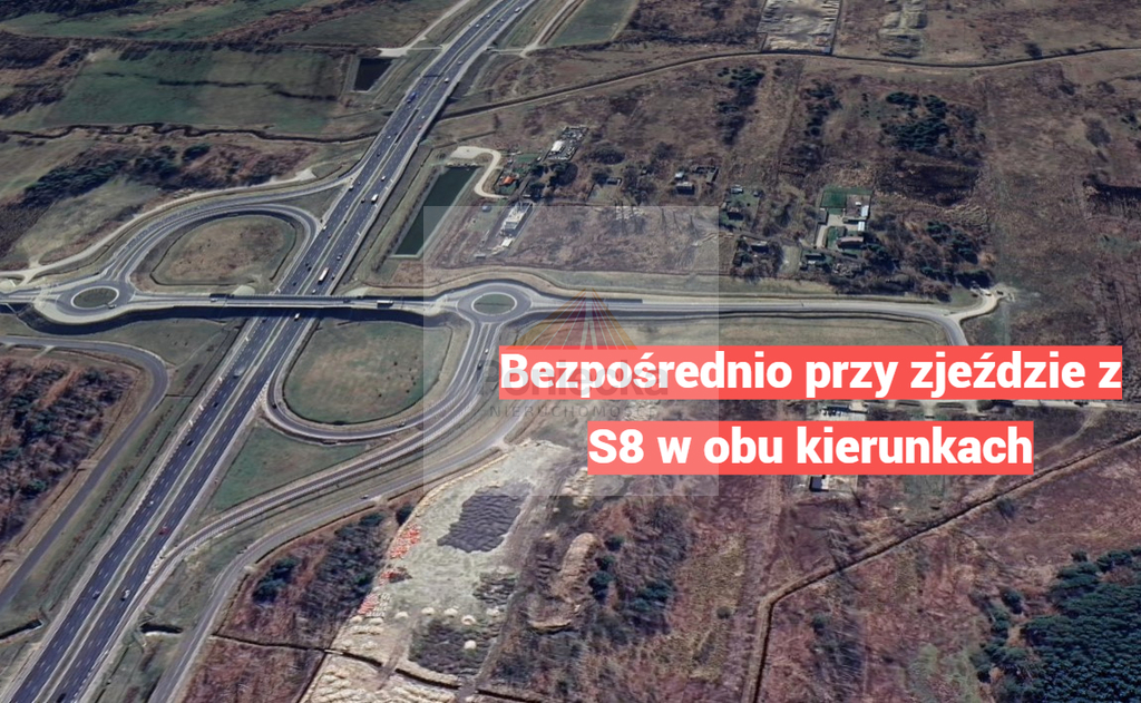 Nieruchomość gruntowa położona bezpośrednio przy zjeździe z S8, przy drodze asfaltowej.