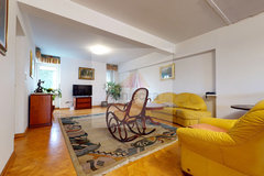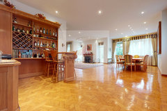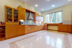 - parter domu hall 28 m2, bardzo duży salon (100 m2) z częścią jadalną i kącikiem kominkowym, z salonu wyjście na taras i do ogrodu. Z salonem łączy się duża, widna kuchnia (31.1 m2).