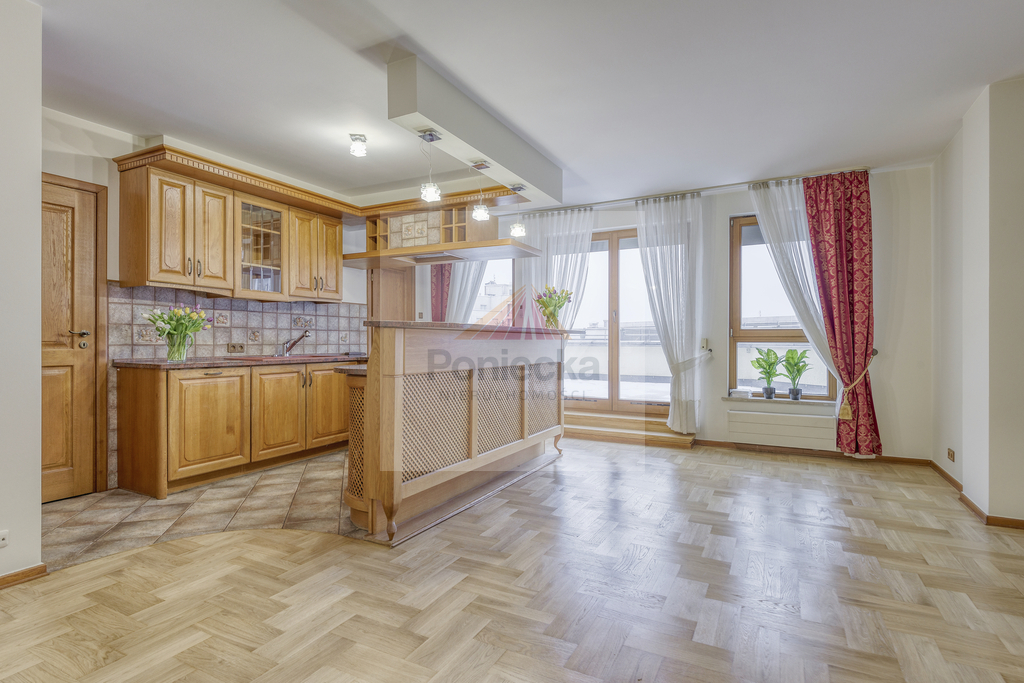 I am offering an attractive, exceptionally bright apartment of 133 m2 with a large 60 m2 terrace, located on the 10th floor at Słomińskiego 19 for rent. The unit benefits from excellent natural light, with windows facing south-west and north-east.