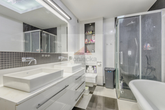 Okna PCV, na podłodze wysokiej klasy podłoga z egzotycznego drewna oraz gres.