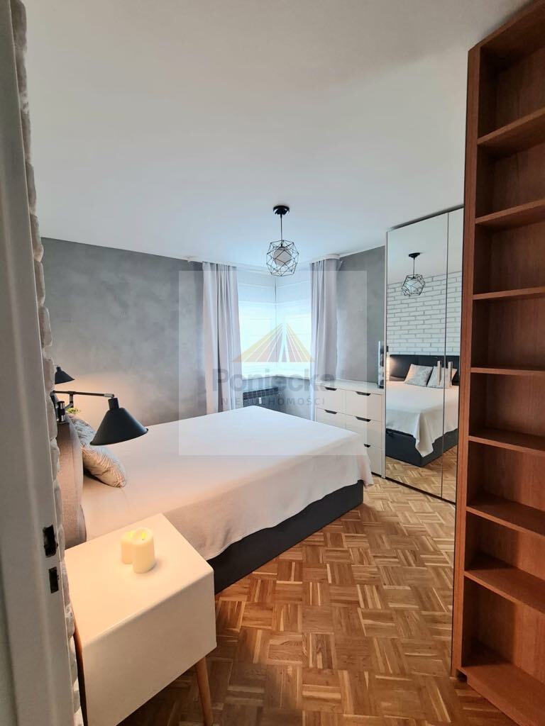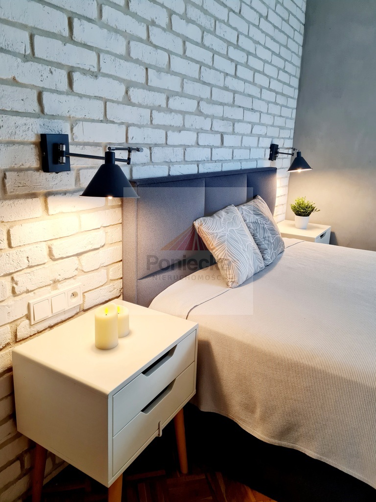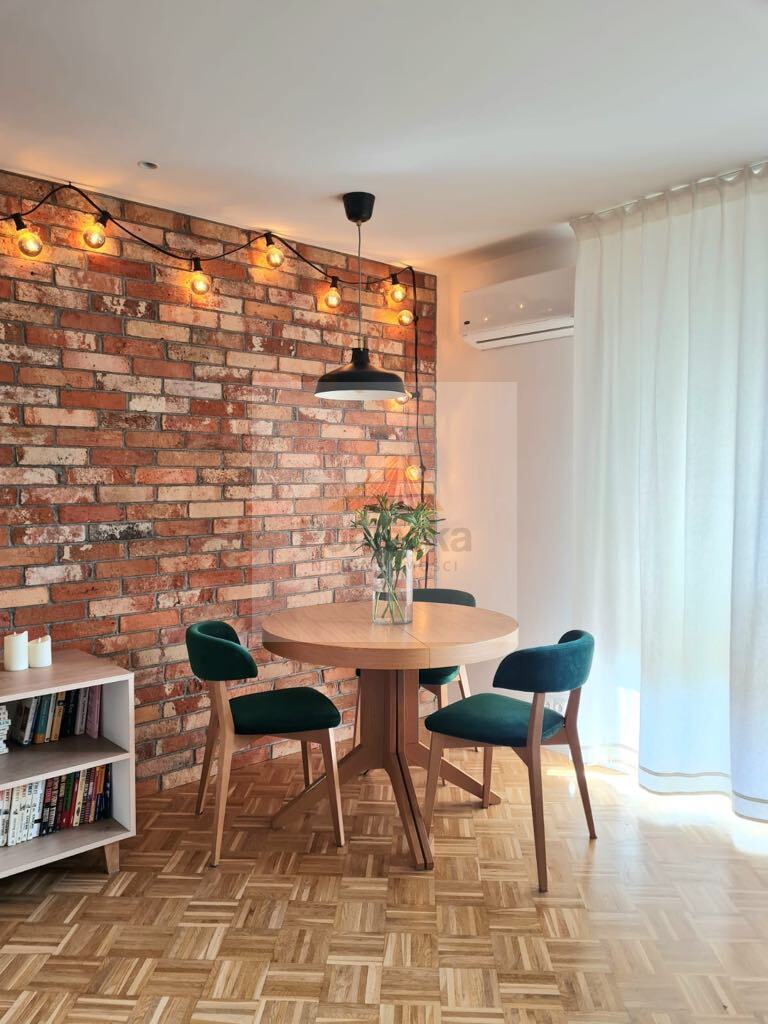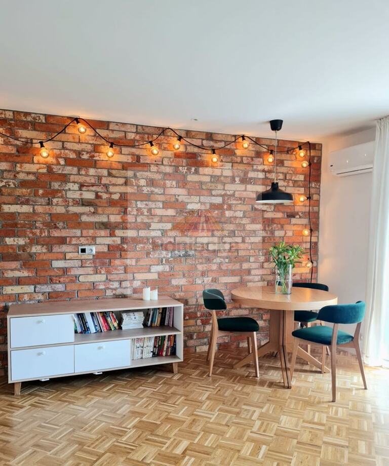 Przestrzeń 61,5 m2 została zaprojektowana przez architekta wnętrz tak, by łączyć styl z codzienną funkcjonalnością. Parkiet po cyklinowaniu (2020) w świetnym stanie, a ściany pokryto gładziami wzmocnionymi siatką i efektownymi panelami (beton, biała cegła, retro cegła z podświetleniem).