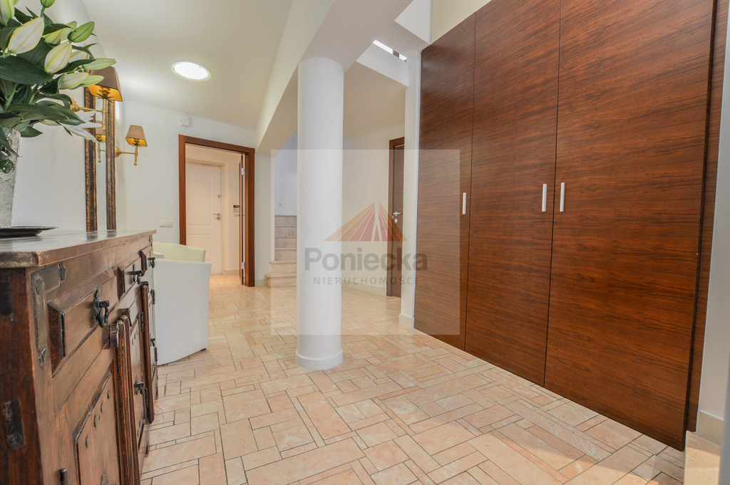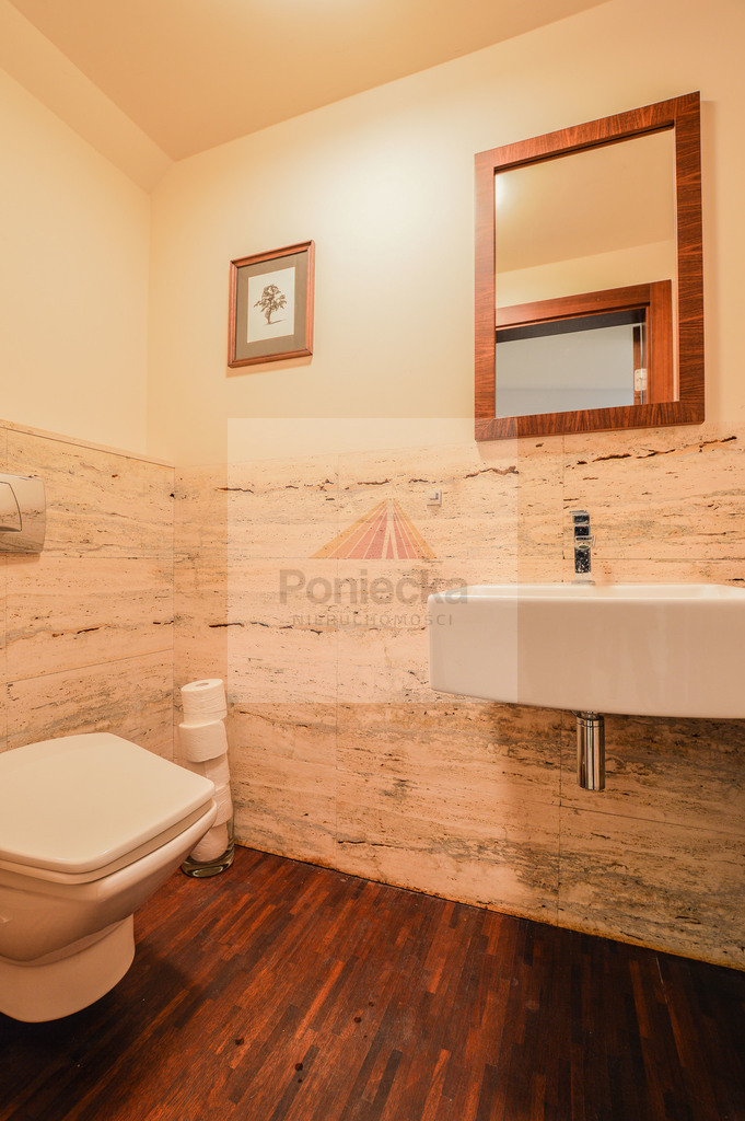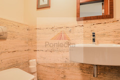 Hol wejściowy z dużą szafą i łazienką gościnną, podłoga i łazienki w naturalnych kamieniach.