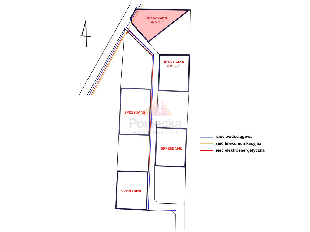W drodze wewnętrznej, bezpośrednio przy działce znajduje się sieć wodociągowa, energetyczna, światłowodowa.