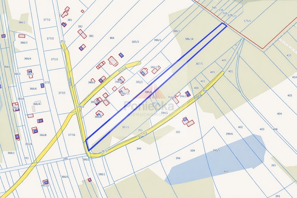 Działka o wydłużonym kształcie, z wyraźnym podziałem na część budowlaną i leśną, co daje możliwość realizacji zabudowy z bezpośrednim dostępem do prywatnego terenu leśnego.