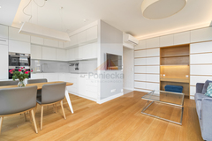 Mieszkanie zostało wykończone w podwyższonym standardzie. Jest w pełni umeblowane i wyposażone, z eleganckimi zabudowami stolarskimi wykonanymi na wymiar.