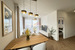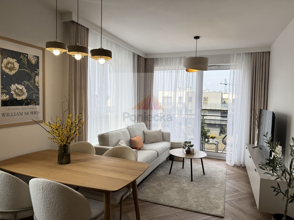 Salon z aneksem kuchennym to serce mieszkania - jasny, harmonijny, otwarty na światło i balkon.
