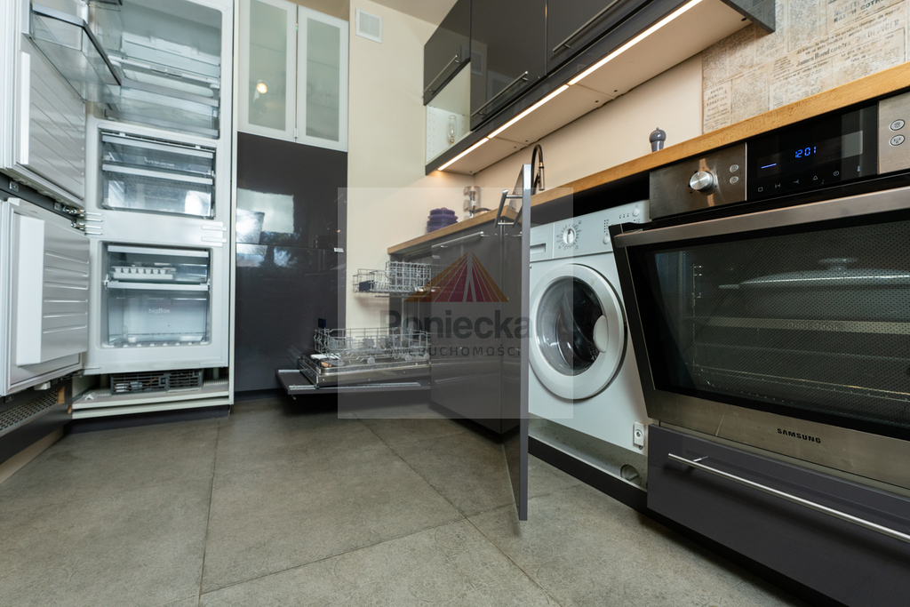 Kuchnia wykonana na wymiar i w pełni wyposażona (zmywarka, lodówka, piekarnik, płyta, okap, pralka, chłodziarka do wina). Całość utrzymana w nowoczesnym, spójnym stylu.
