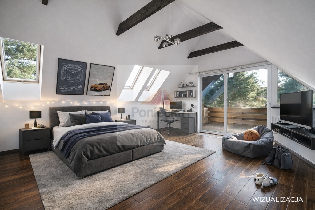 -przestronny pokój z dużymi przeszkleniami i wyjściem na loggię/balkon na stronę zach. z widokiem na ogród