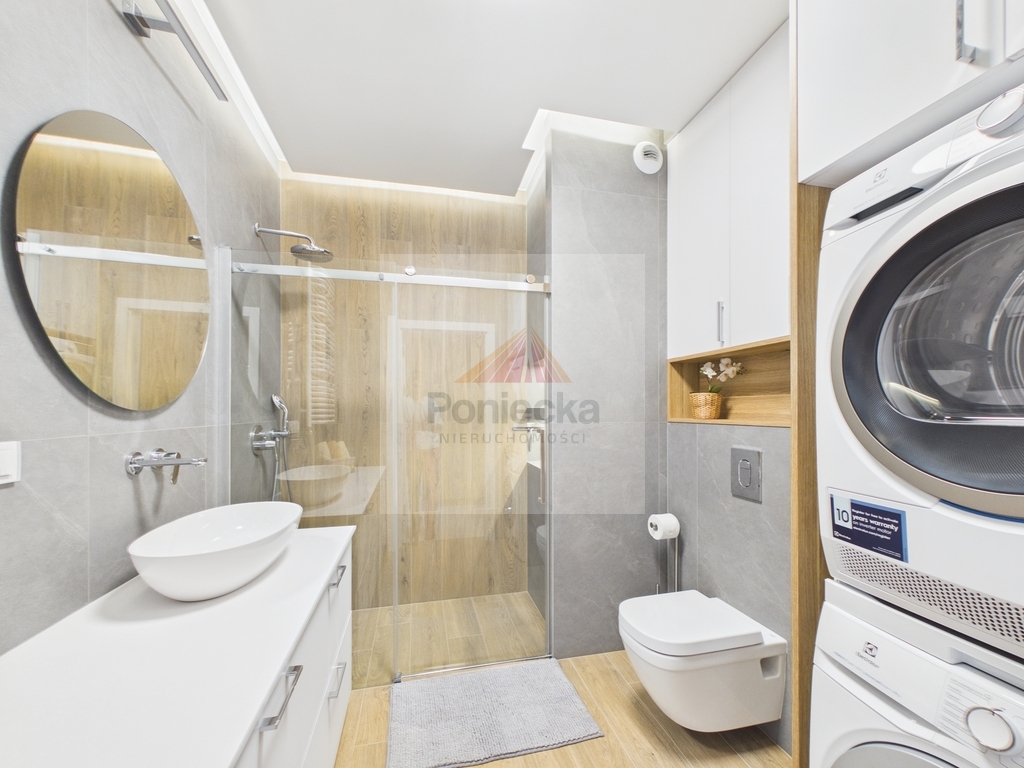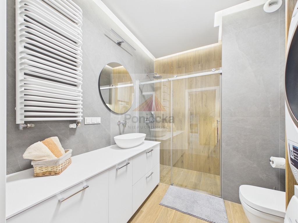 -Łazienka z domową strefą spa Nowoczesna łazienka z kabiną prysznicową i WC została zaprojektowana z myślą o Twoim komforcie. Ogromnym atutem jest obecność pralki oraz osobnej suszarki, co sprawia, że pielęgnacja ubrań staje się niezwykle prosta i szybka.