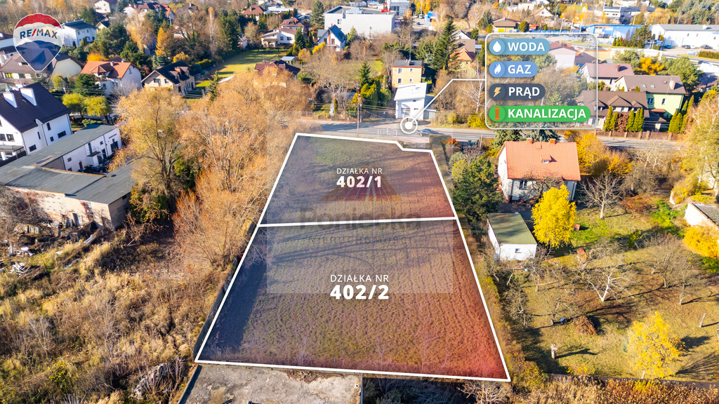 - działkę 402/1 o powierzchni 1158 mkw. Szerokość ok. 29 m, głębokość ok 36-40 m, płaska, niezadrzewiona, posiada POZWOLENIE NA BUDOWĘ domu w zabudowie bliźniaczej o pow. 135,90 mkw każdy, teren biologicznie czynny 579 mkw, teren utwardzony 307,20 mkw