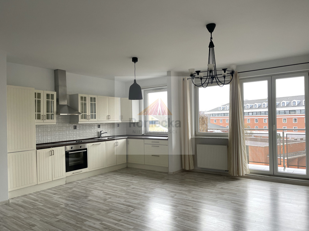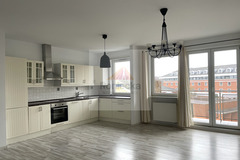 * Pięknie doświetlony salon z wyjściem na duży balkon, z otwartą, w pełni wyposażoną w AGD kuchnią(zmywarka, lodówka z zamrażalnikiem, płyta elektryczna, piekarnik, okap oraz pralka)