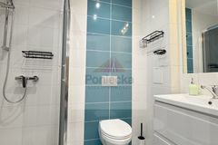 - oddzielna, funkcjonalna kuchnia zlokalizowana tuż przy wejściu do mieszkania. wyposażona w szafki w zabudowie, płytę elektryczną, mikrofalę, małą lodówkę. Znajdziemy tu również pojemną szafę na okrycia wierzchnie,