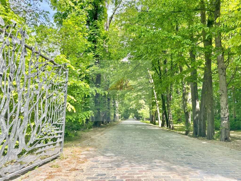 Wjazd brukowaną kostką bazaltową aleją z starymi klonami i kasztanami.