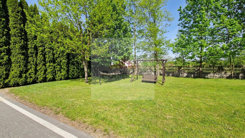 Teren działki jest bardzo zadbany, obsadzony wysokimi tujami, przed domem i garażem położona kostka. Wydzielone miejsce na wypoczynek, hamak, ławeczka.