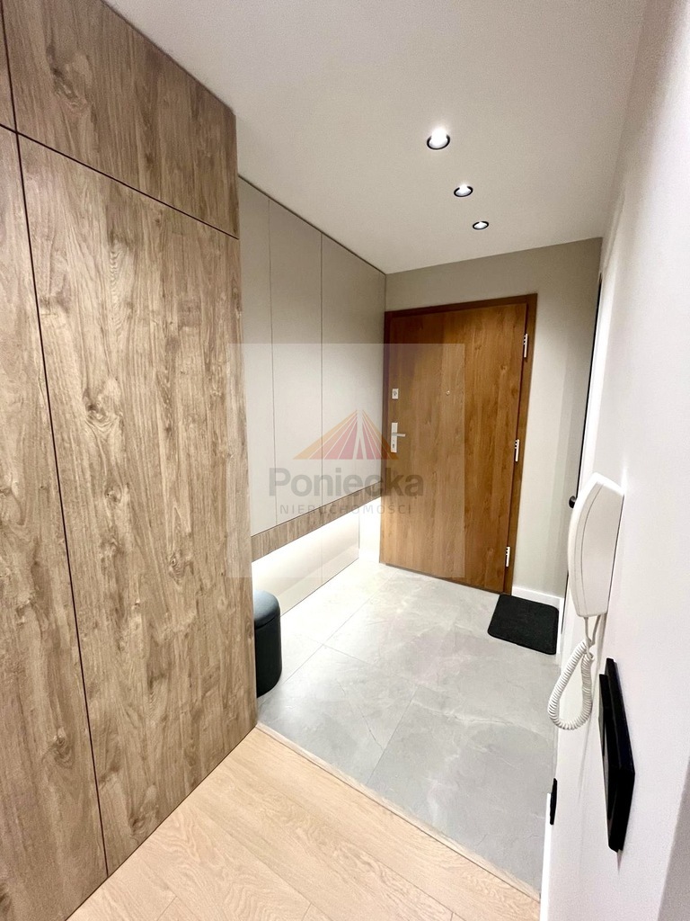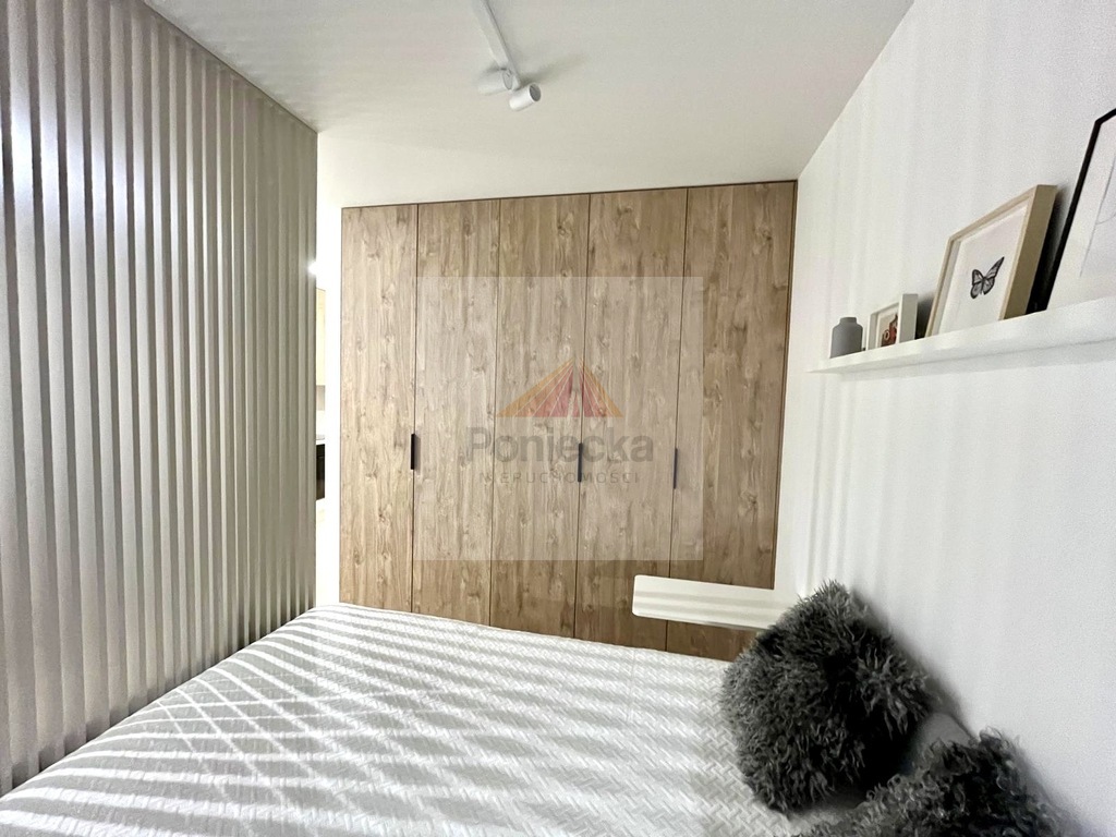 Pokój dzienny - umeblowany, jasny, otwarty na kuchnię, stolik do pracy/nauki, z wyjściem na balkon, klimatyzowanyKuchnia - otwarta na salon z meblami w zabudowie, ze sprzętem AGD - piekarnik, płyta indukcyjna, zmywarka, lodówka, okap.Łazienka - prysznic typu walk-in, wc, na wyposażeniu pralka, zabudowa meblowaPrzedpokój - z zabudowaną szafą i lustremSypialnia - oddzielona od pokoju dziennego lamelami, z oknem, przytulna strefa, zabudowana dużą szafą