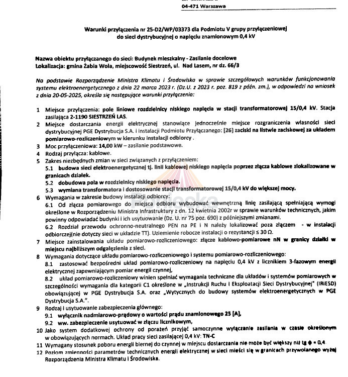 Cena działki zawiera podatek VAT, dzięki czemu kupując oszczędzasz 2% na podatku PCC. Na wszystkie działki właściciel podpisał umowy z operatorem energetycznym (PGE). Przyłączenie planowane jest na grudzień 2026r. W przygotowaniu jest wykonanie wodociągu w drodze wewnętrznej (bez przyłączy do poszczególnych działek). Termin budowy zaplanowany na czerwiec 2026r.