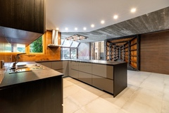 It impresses with its approximately 6-meter-high living room with panoramic windows offering views of the beautiful greenery of the garden.