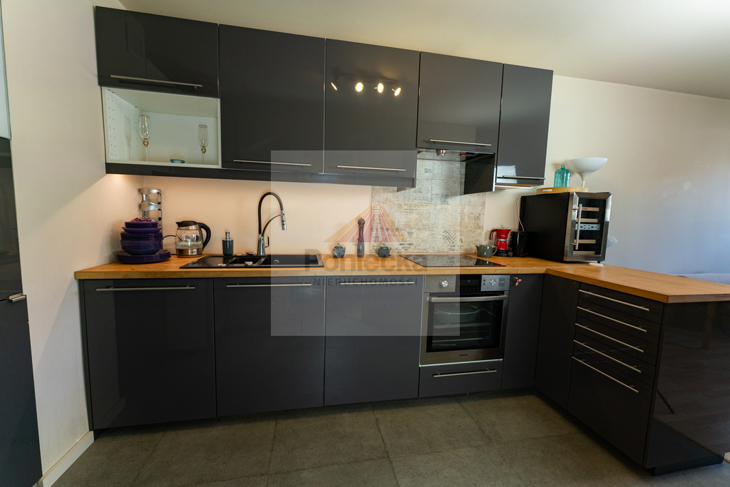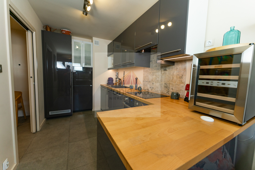 Kuchnia wykonana na wymiar i w pełni wyposażona (zmywarka, lodówka, piekarnik, płyta, okap, pralka, chłodziarka do wina). Całość utrzymana w nowoczesnym, spójnym stylu.