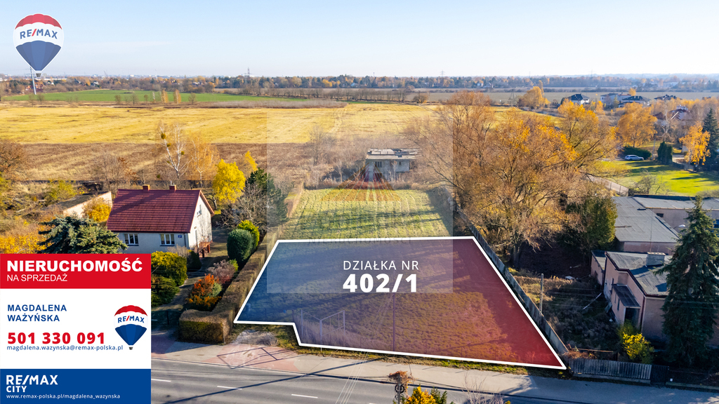- działkę 402/2 o powierzchni 950 mkw. Szerokość ok. 29 m, głębokość ok. 32 m, płaska, niezadrzewiona.