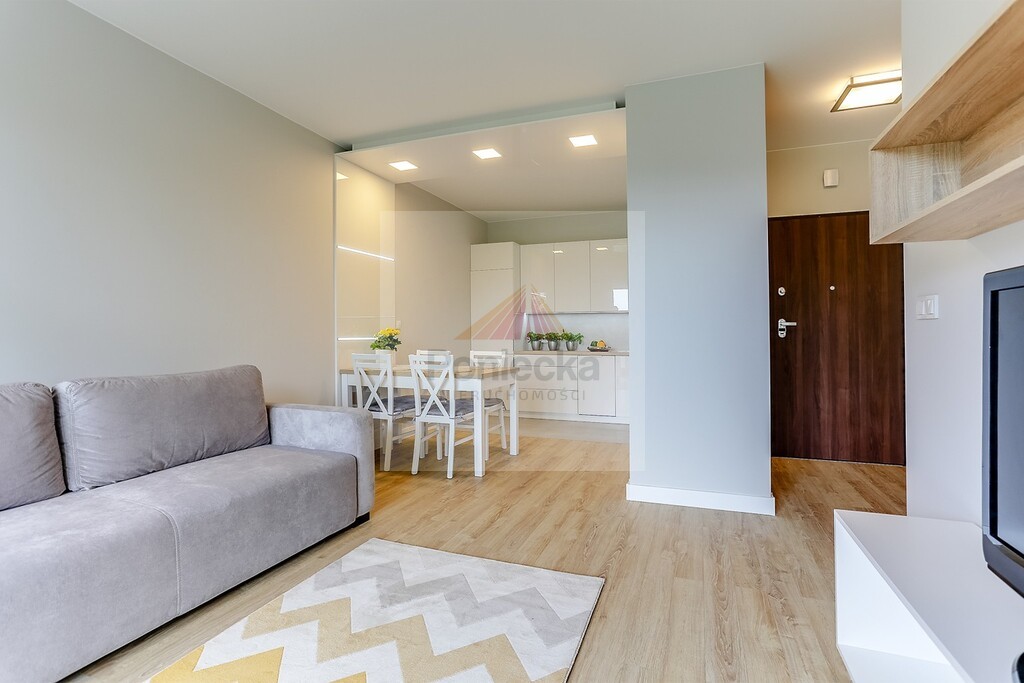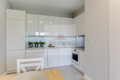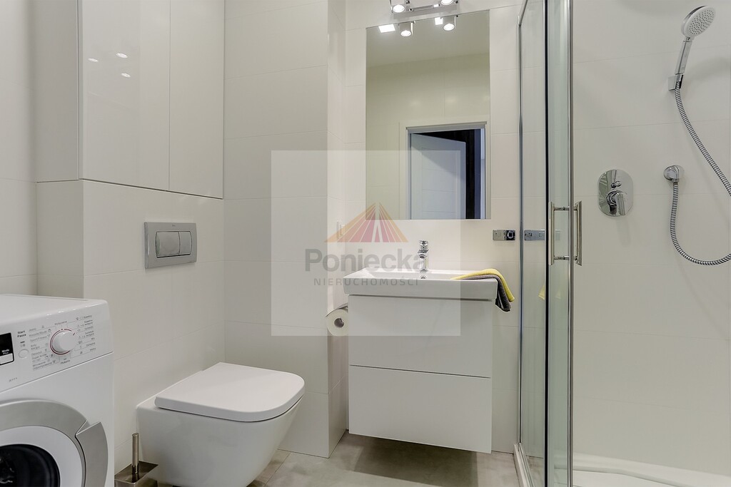 Mieszkanie zaprojektowane przez architekta z dbałością o każdy detal. Meble wykonane na zamówienie. W kuchni meble w zabudowie, duża lodówko-zamrażarka, zmywarka, płyta elektryczna i piekarnik, a także rozkładany stół z 4 krzesłami. W salonie rozkładana sofa, szafka RTV oraz półki wiszące. W przedpokoju szafa wnękowa. W sypialni duże łóżko o wymiarach 160x200 cm, pojemna szafa wnękowa oraz szafki nocne. W łazience duża kabina prysznicowa, umywalka, w oraz pralka. Przestronny balkon.