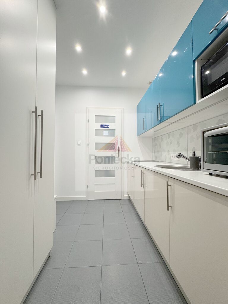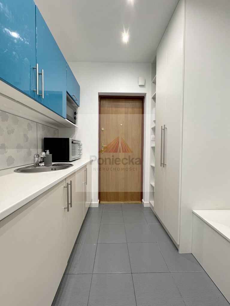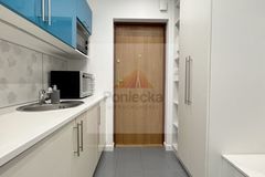 - oddzielna, funkcjonalna kuchnia zlokalizowana tuż przy wejściu do mieszkania. wyposażona w szafki w zabudowie, płytę elektryczną, mikrofalę, małą lodówkę. Znajdziemy tu również pojemną szafę na okrycia wierzchnie,