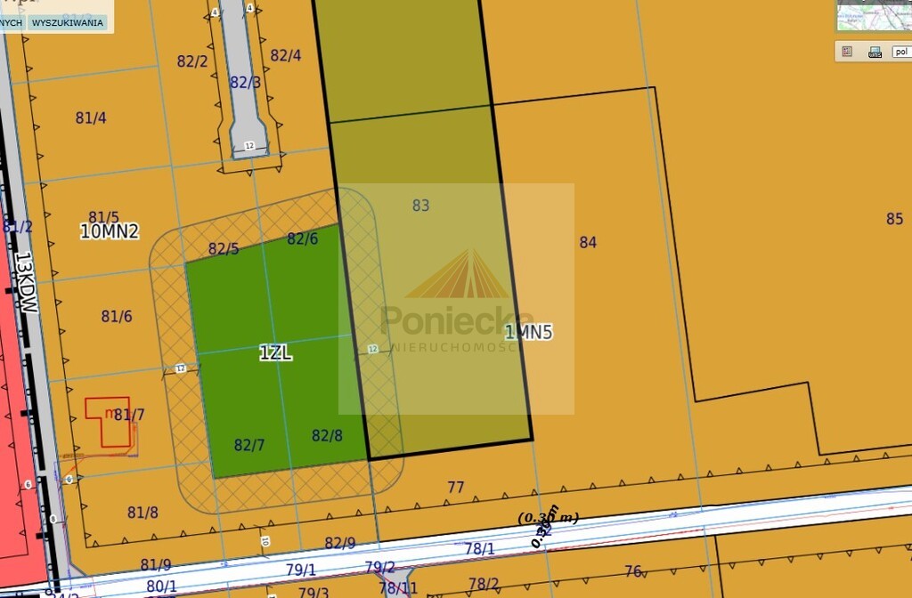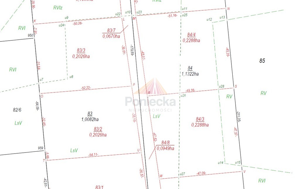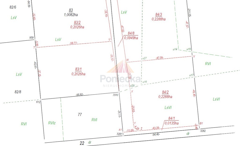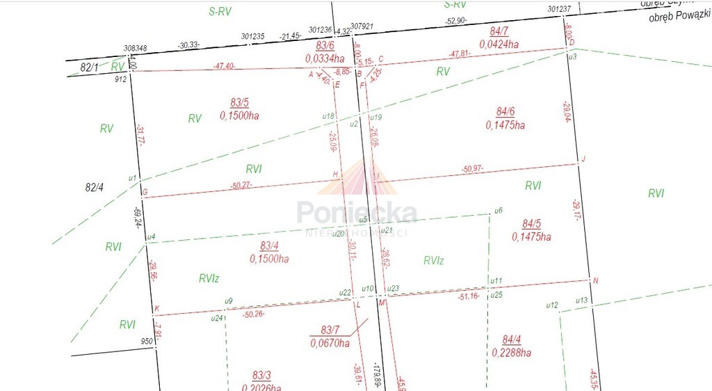 Działki po świeżym podziale geodezyjnym, jeszcze nie naniesione przez urząd na mapę. Aktualnie na mapie jako działki 83, 84 (obręb Powązki) przy ul. Przytulnej obok numeru 22A.